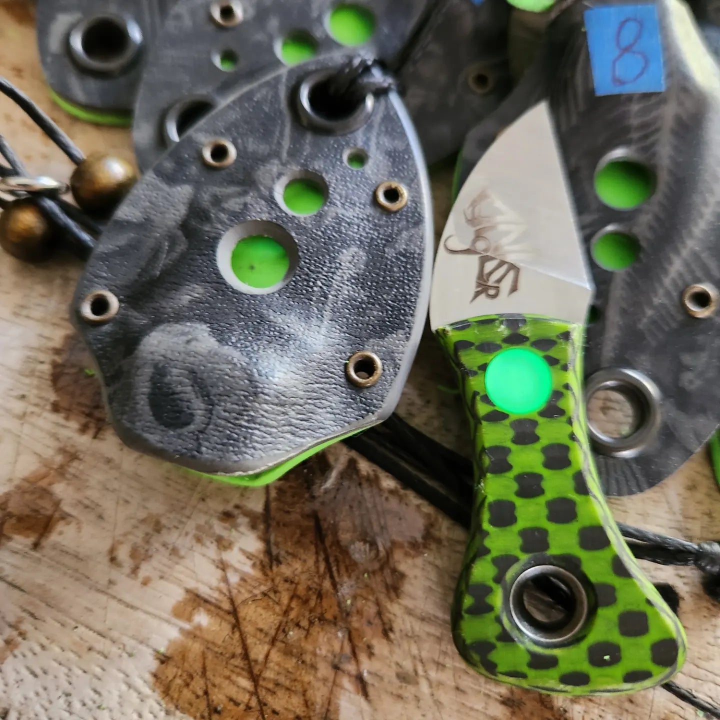 This Anchovy features a Carbon Fiber G10 neon green and black blend. Top glow pin flared stainless lanyard hole.