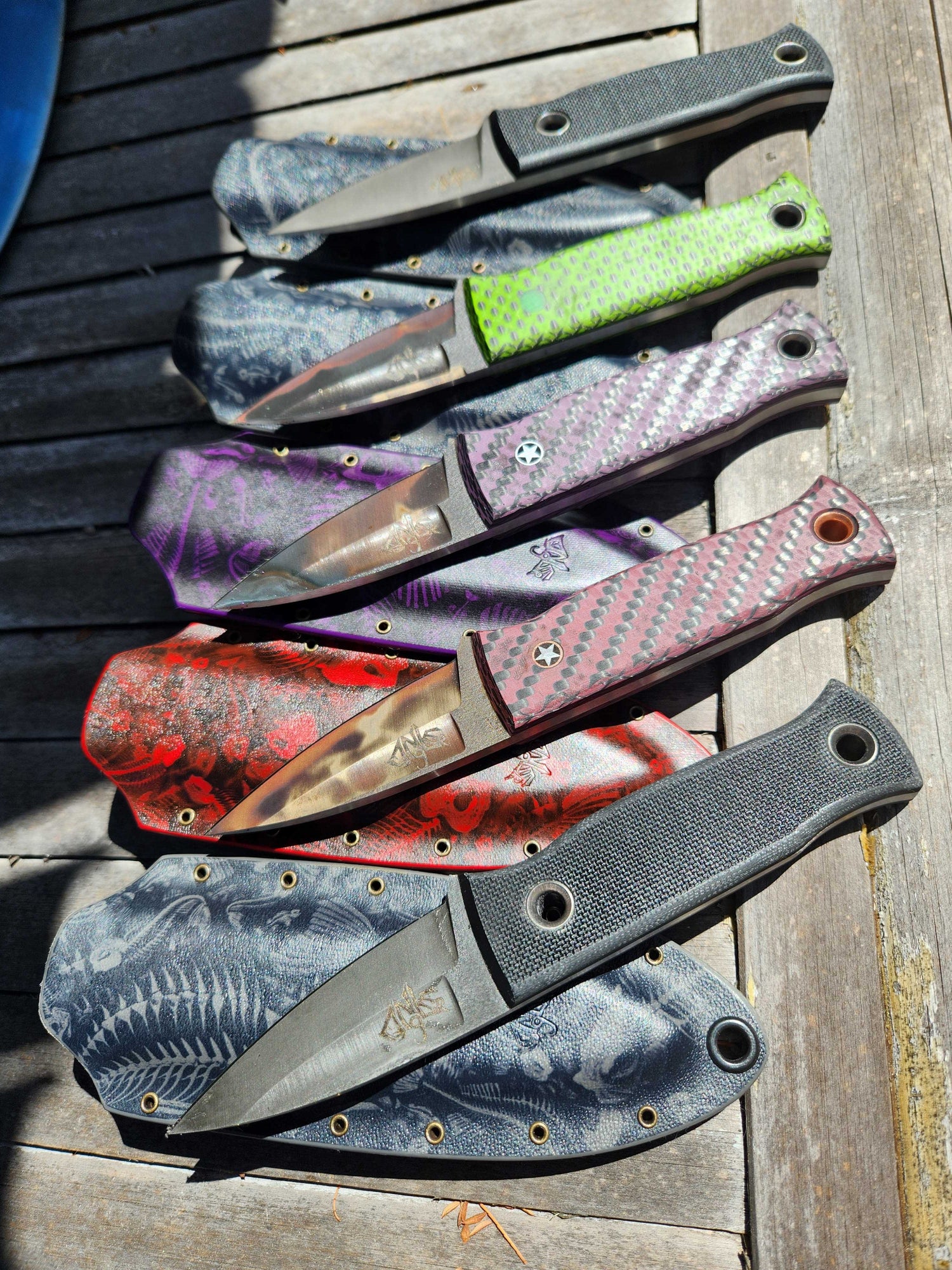 We use both carbon fiber and G10 for handling our knives. Mosaic top pins and flared lanyard tubes bind the handle in addition to West Systems Epoxy