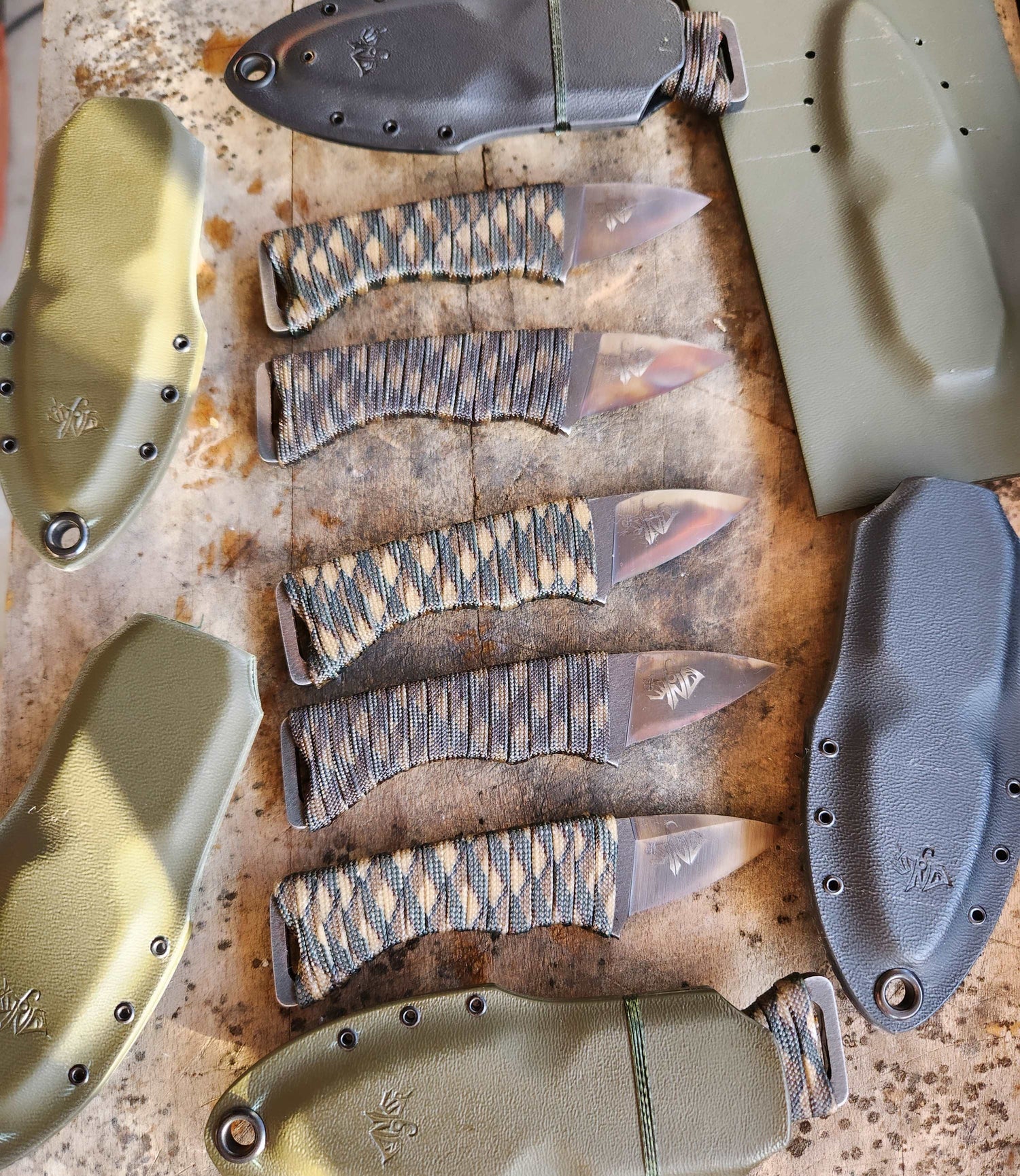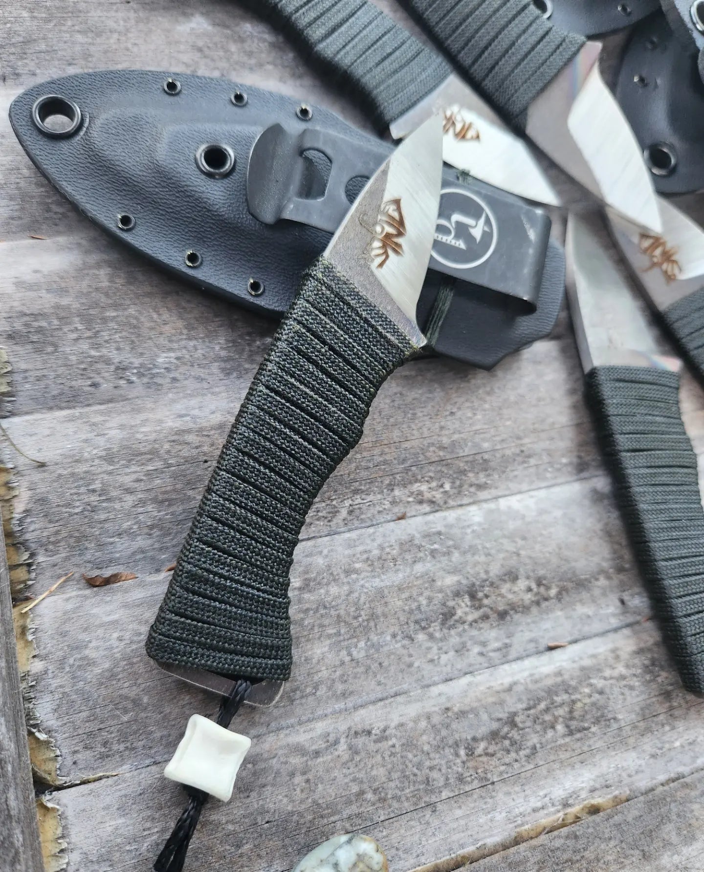 The epoxied paracord flat rap is our favorite handle option on the Swimmer creating a very slim and sleek package. The deep carry ambidextrous sheath provides a thin, secure and easily accessible carry ability.